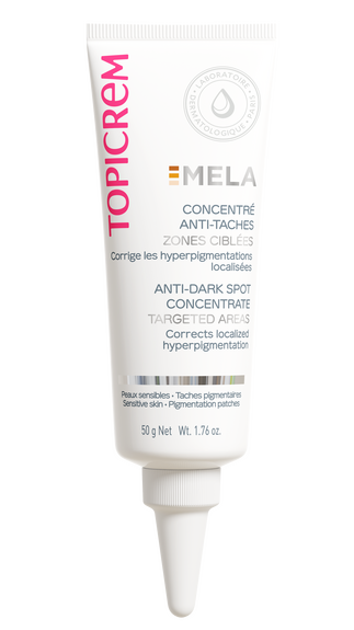 Le Topicrem MELA Concentré Anti-Tâches Zones Ciblées est un soin correcteur destiné à traiter les taches pigmentaires localisées (visage, mains, corps). Il fait partie de la gamme MELA spécialisée dans l’hyperpigmentation.